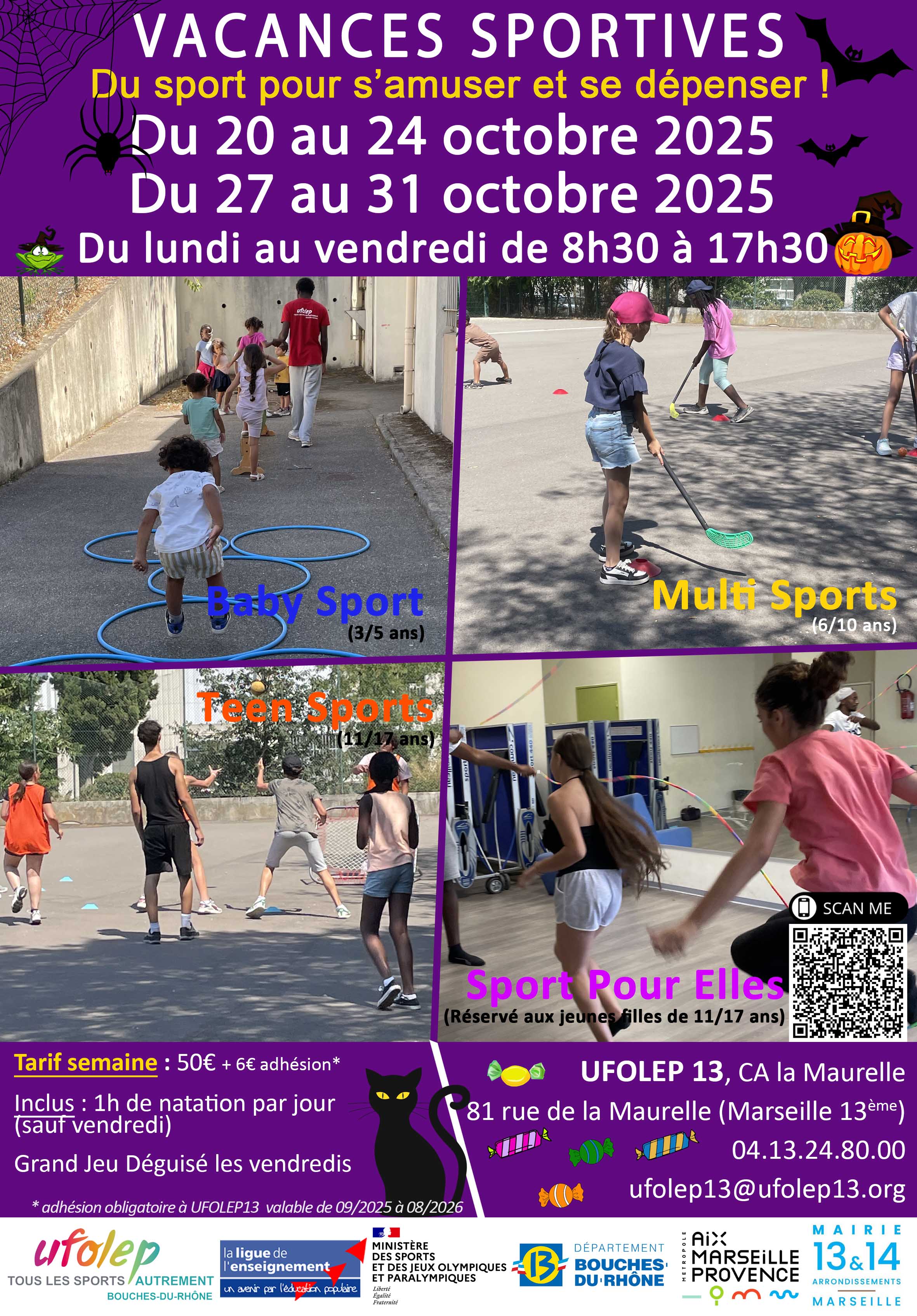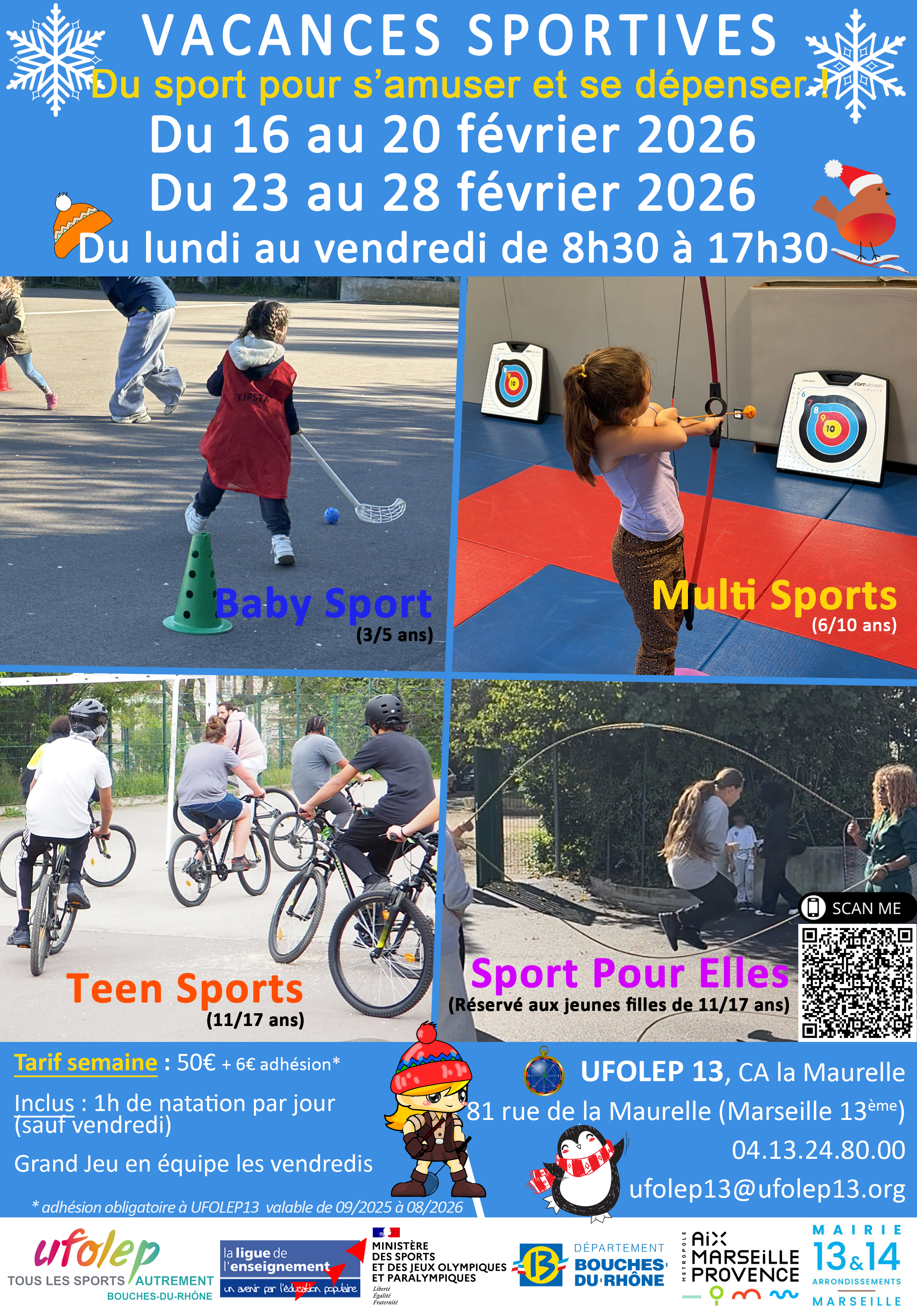 Durant les vacances scolaires, l'UFOLEP 13 propose des stages sportifs pendant les vacances scolaires sur le site du Centre d'Animation La Maurelle (81 rue de La Maurelle, Marseille 13ème), pour les enfants de 3 à 17 ans.