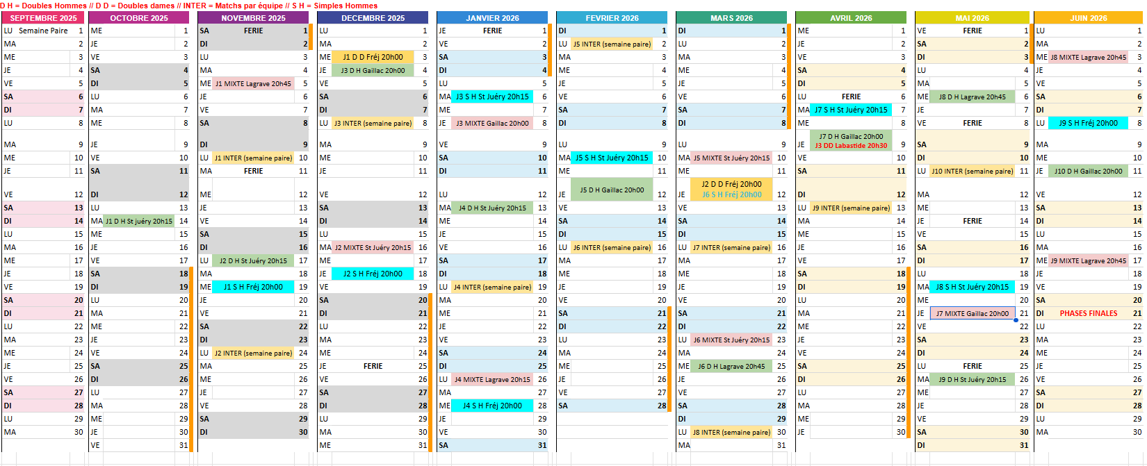 Calendrier saison 2025-2026